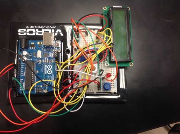 Este proyecto funciona como un termostato, donde puedes ver la temperatura actual (en grados Fahrenheit o en centígrados), puede fijar la temperatura deseada y se puede cambiar entre ° f y ° Celsius. Hay una luz LED que se enciende automáticamente cuando la temperatura es superior a la temperatura deseada. Allí se supone que es un motor de C.C. aplicado en lugar de la luz, sin embargo no tenía un motor de corriente continua de trabajo.