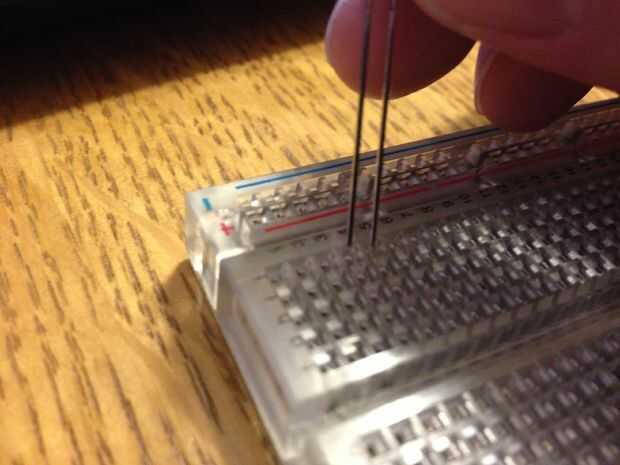 El LED del medio es un poco más complicado, y se trataba de tirar las patillas un poco más amplias y teniendo en la fila 11 y 8 a cada lado (no se tiene el 9 y 10 porque llevan a cabo en filas)