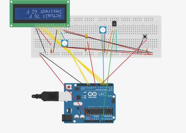 En primer lugar configurar el LCD, normalmente podrá consultar los pasos armarlo. A continuación, después de que la pantalla LCD está en marcha, configurar el sensor de temperatura para que muestre en la pantalla LCD. Tercer paso es que usted necesita configurar el botón para que al pulsar el botón cambia la temperatura de Fahrenheit a Celsius. Ahora que la temperatura puede cambiar de Fahrenheit a centígrados, agregar un potentiameter, por lo que se puede tener una temperatura deseada, con que potentiameter serás capaz de cambiar la temperatura deseada. Por último usted necesita configurar una luz LED, colores pueden variar y que gire cuando la temperatura real. es superior a la temperatura deseada.