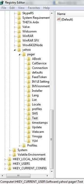 Ir a "HKEY_CURRENT_USER/Software/yahoopager/test". Haga clic en la carpeta "prueba" y usted encontrará sólo el valor del registro "por defecto".