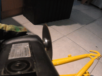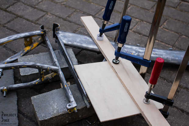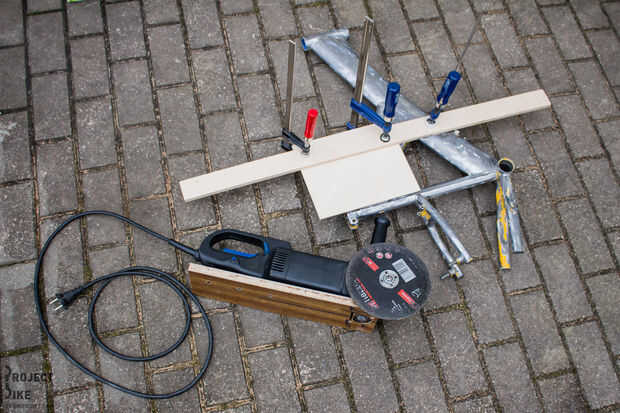 Os adjunto esta pieza rectangular a la que sería la parte inferior de una amoladora de ángulo con uno de los agujeros diseñados para la manija de la amoladora (un tornillo de 12mm regular hizo el truco). Entonces establecer un borde recto paralelo a la mitad del tubo del asiento con una superficie plana para el desplazamiento de la amoladora en. Yo también encerado el borde que va ser deslizante contra para evitar pegarse de corte medio y la posibilidad de corte disco rompiendo y otros temas. Se puede ver la configuración en imágenes.