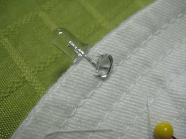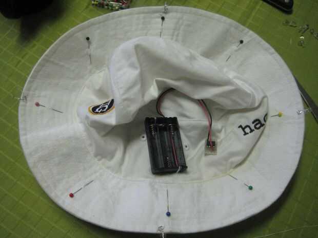 Utilizando hilo de rosca llano, coser los LED y la batería pack/perf Junta Directiva el sombrero.