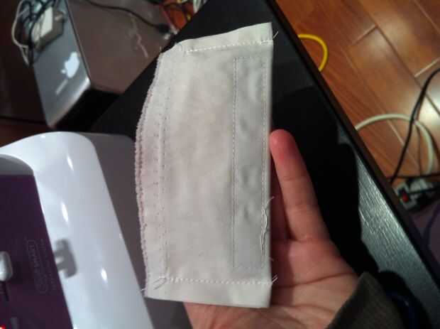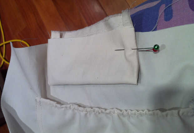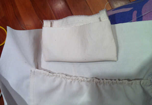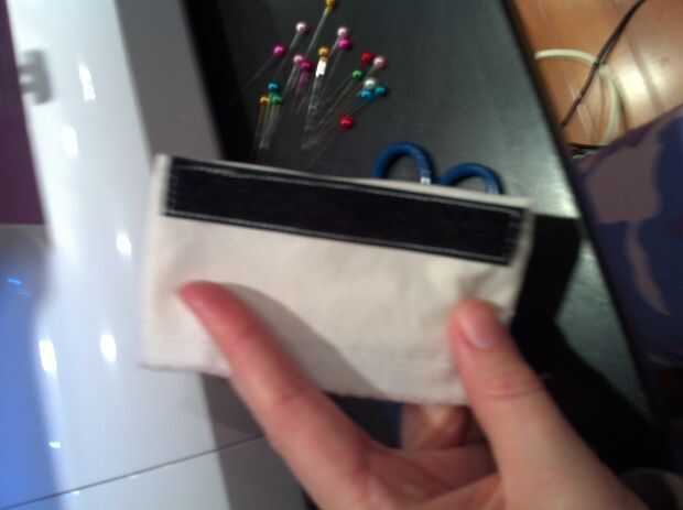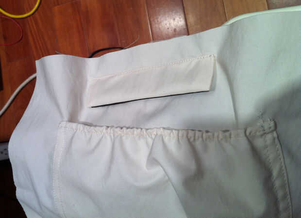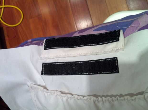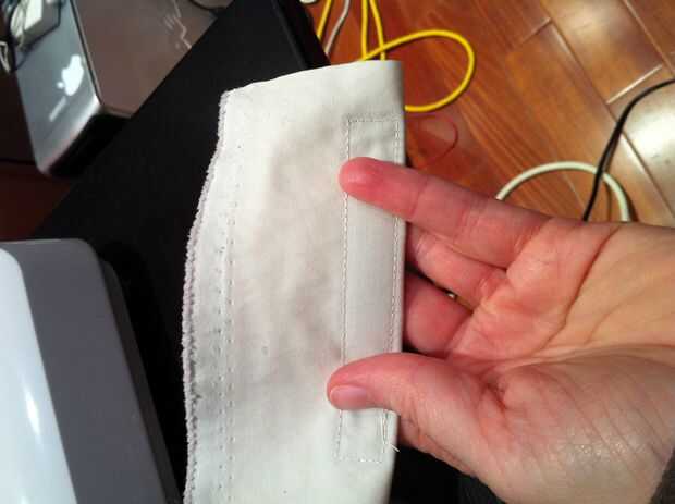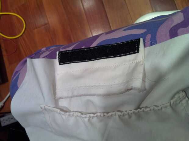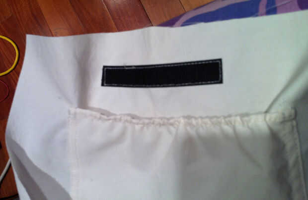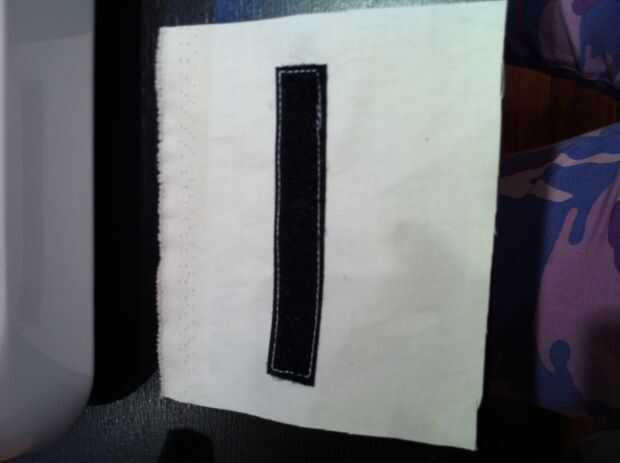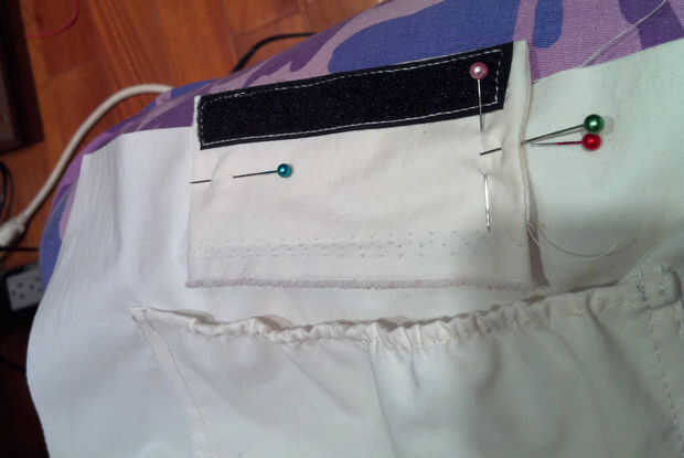 Coser las piezas de velcro formas un poco encima de los bolsillos. Hacer una aleta cortando un rectángulo de una pulgada o tan más ancha que las piezas de velcro son largos y el tiempo suficiente para doblar sobre un par de veces--sólo corté lo suficiente cortada posteriormente. Coser la tercera pieza de velcro (loop) por medio de la pieza de aleta y luego doblar la solapa de velcro y puntada en cada lado. Girar el bolsillo que acaba de hacer derecha, por lo que el velcro es accesible otra vez. La aleta en lugar del perno en el lado del gancho, abrir hacia fuera y puntada hacia abajo. Recorte el exceso y pespuntear para cubrir los bordes crudos.