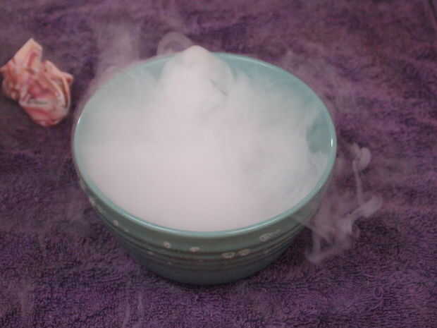 Después de poner el pedazo de hielo seco en el recipiente, luego añadir algunas agua a la taza - llenar hasta 1/2 a 3/4 de lo completo. Verás el ocurrir de proceso de la sublimación.