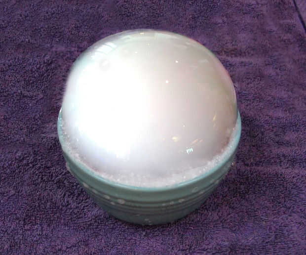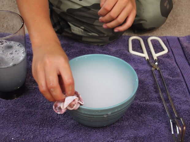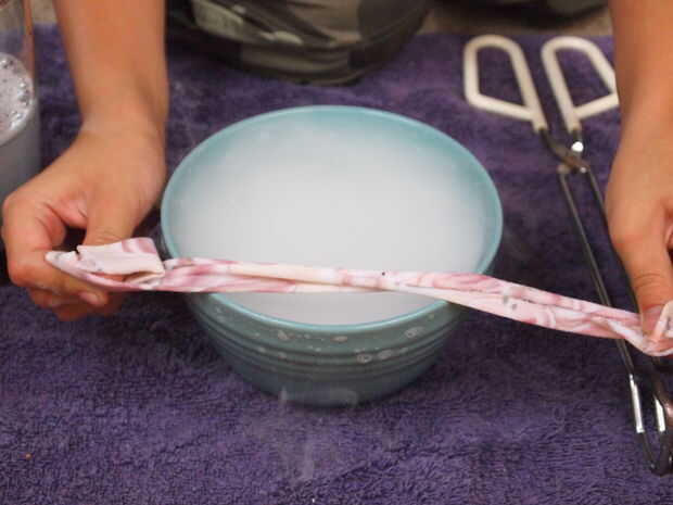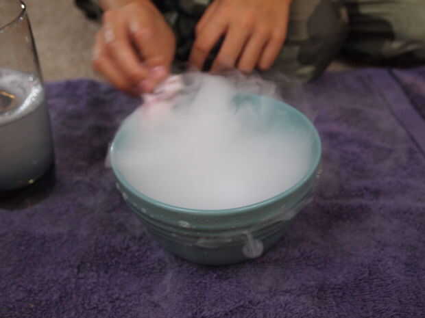 Después de eso, rápidamente sumerja el material detrás en el agua jabonosa y sostener hacia fuera con las dos manos y atraviesan el material de la taza (ver imágenes). Después de hacer esto, usted verá el inicio de la formación de burbujas. Sólo esperar a conseguir más grande y más grande. Si no funciona la primera vez, acabamos de hacerlo otra vez. Puede que necesite añadir un poco más de jabón a la mezcla de agua jabonosa. Si todavía no funciona, puede que necesite añadir un poco más de agua u otro pedazo de hielo seco a la taza. Entonces, a trabajar!