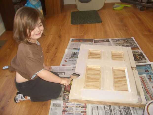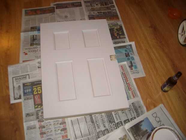 El siguiente paso es tipo de la aburrida... pintura. Llené todos los orificios y lijar con papel de grano 120. No hay magia realmente. Luego configurar el área de pintura en la casa (garaje era de 30 grados) y algunos "ayudantes". Todavía tenía una lata de pintura de cuando hemos pintado la habitación hace 7 años y sorprendentemente estaba siendo bueno! Cuando se trata de puertas de pintura no vaya la espuma ruta cepillo... gran trabajan en la jamba de la puerta y ajuste pero deja rayas en la misma puerta.