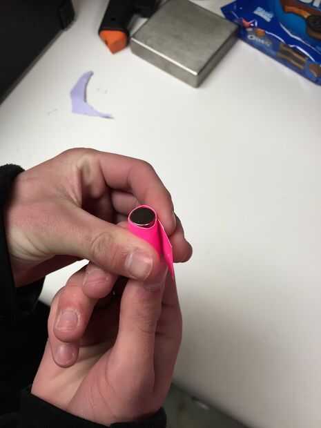 Para crear el cono del altavoz, tomar la cartulina y cortar una sola tira de ella. Luego, envuelva esa franja alrededor de los imanes, dejando algún espacio y pegamento caliente en su lugar.