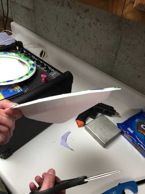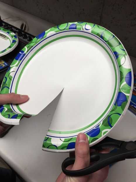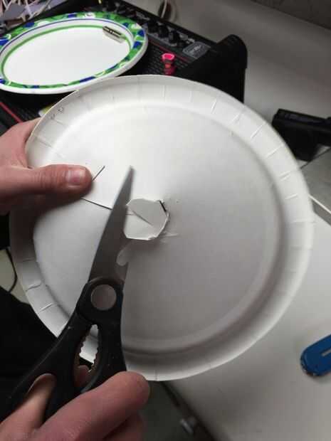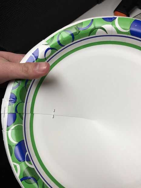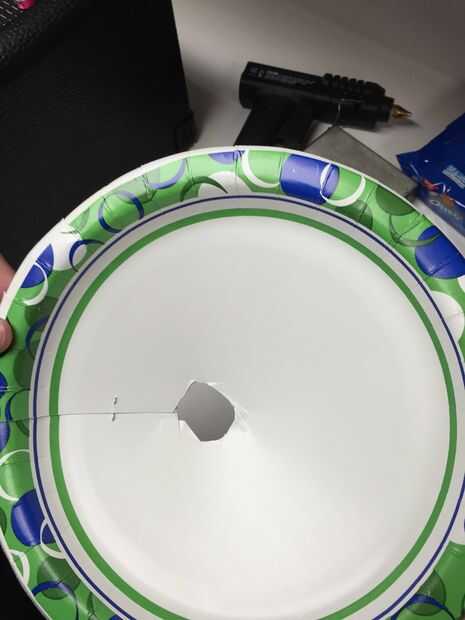 Para crear la placa superior, tome un plato de papel y corte una abertura en ella; va aproximadamente a medio camino en la placa. A continuación, se superponen las dos aletas para crear una forma de"cono" y utilizar grapas para mantener la forma. Finalmente, tomar las tijeras y corte un orificio en la parte inferior del cono para hacer espacio para las bobinas.