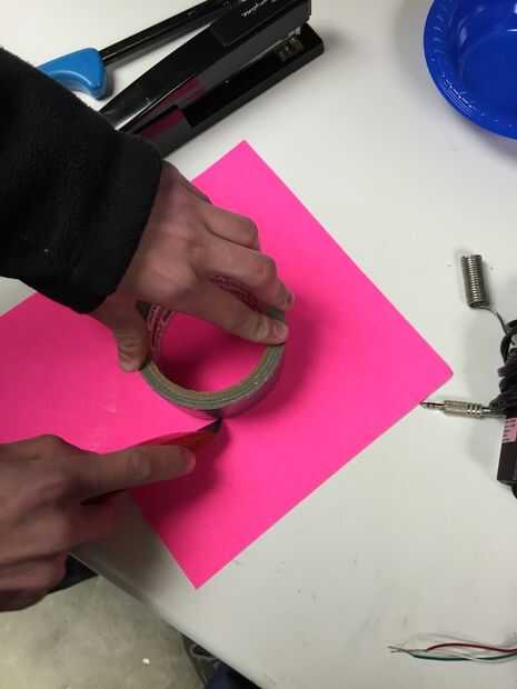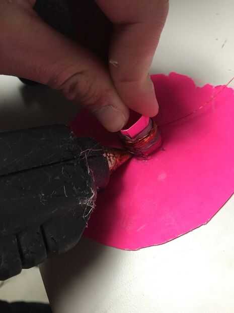 Tome la cartulina y cortar un círculo de ella. A continuación, tomar el conjunto de bobina y pegamento caliente a esta pieza en el centro. Entonces, pegamento caliente todo el conjunto a la placa superior, asegurándose de que las bobinas y el exceso de cable se ajustan a través del orificio inferior.