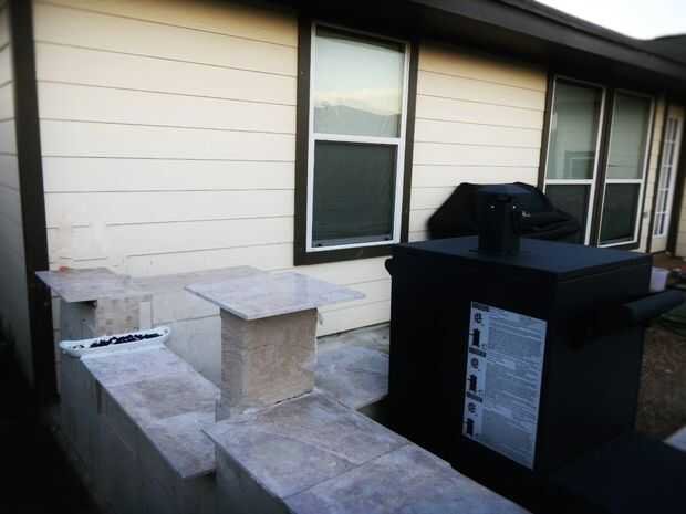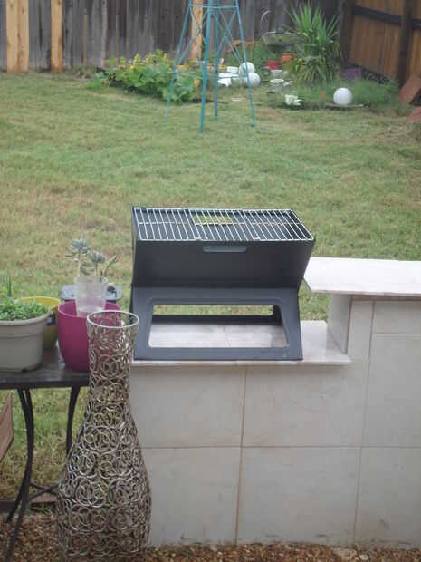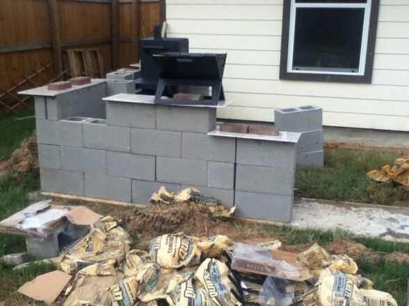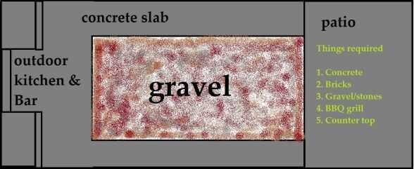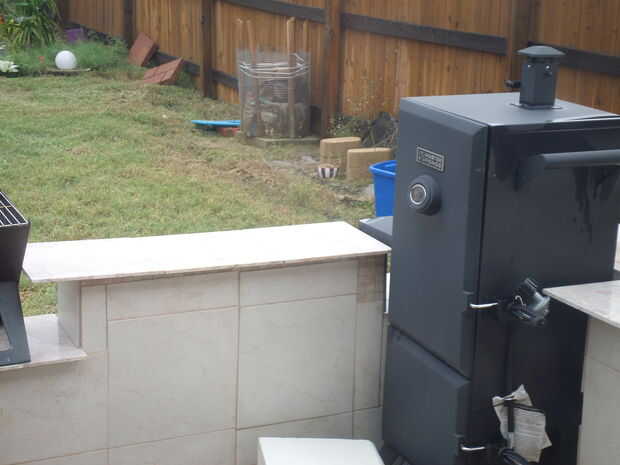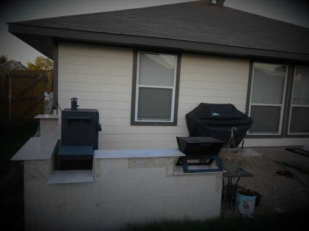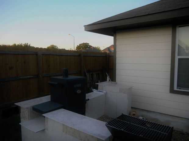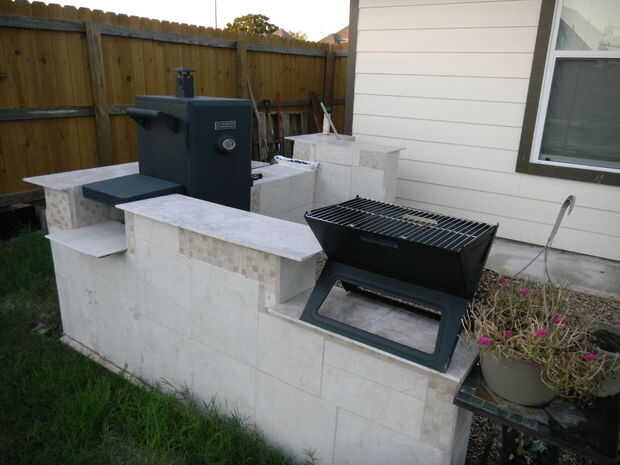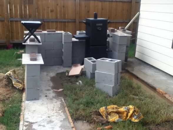 Específicos: La excavación siguió mezclando las bolsas de concreto - tuvimos que utilizar cerca de 35 de las bolsas de 80lb. Hemos esperado unos días dejar el área completamente secado. Luego pusimos bloques de hormigón según el espacio que necesitábamos y para asegurarse de que el fumador y el gas grill ajuste así. También dejamos un espacio entre la pared trasera y la parrilla por motivos de seguridad. Luego llena la mayoría de los bloques y espacios con cemento. Después de que se había secado bien, mezclan el mortero seguido de mosaico. Finalmente, las baldosas con lechada y dejó durante dos días. Lo ultimo fue agregar cierto estilo - hemos añadido algunos guijarros y grava y algunas decoraciones en la parte superior.