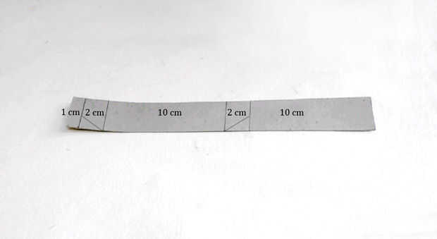 Tomar una tira de cartulina y hacer marcas a intervalos de 10 cm, 2 cm, 10 cm, 2 cm, 1 cm