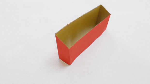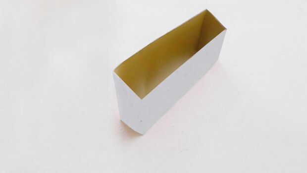 Doblar la cartulina fina y juntar los bordes para hacer un recipiente inclinado.