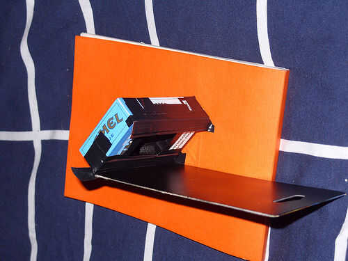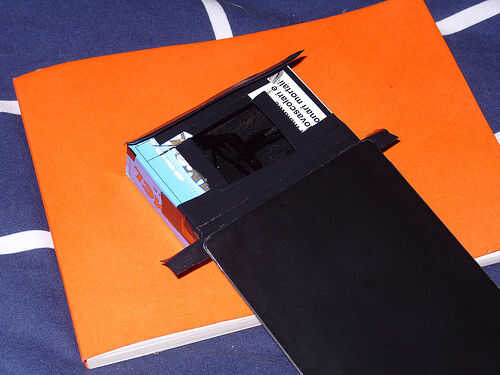 En la base de la cámara, bajo la ventana de marco, he pegado un trozo pequeño de cartón (1cm de altura), esta es la guía de la película, para no desaparecer y permanecer horizontal.