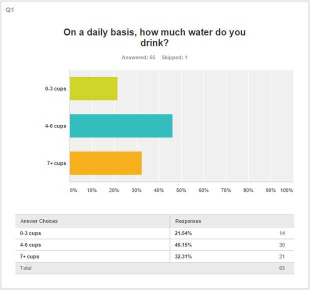 La cantidad recomendada de agua es generalmente 64 onzas o aproximadamente 8 tazas al día. Con la información obtenida en la encuesta aparece que el 68% de los estudiantes no beba suficiente agua. Esto puede conducir a una multitud de problemas de salud que puede hacer aún más difícil la vida universitaria. Así que decidimos llegar a los estudiantes.