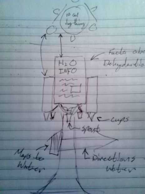 Todas estas son ideas interesantes y probablemente vale la pena considerar. Pero que nos acomodamos en una pequeña campaña para tratar de dar a los estudiantes un recordatorio visual para beber agua. Nos fuimos con esta opción sobre todo debido a las limitaciones de tiempo y conocimientos de miembros del grupo. También no teníamos mucha experiencia técnica con nuestros miembros de equipo para construir o programar nada. Tuvimos un miembro que estaba interesado en diseño gráfico sin embargo y pensó que podrían hacer un cartel fantástico.