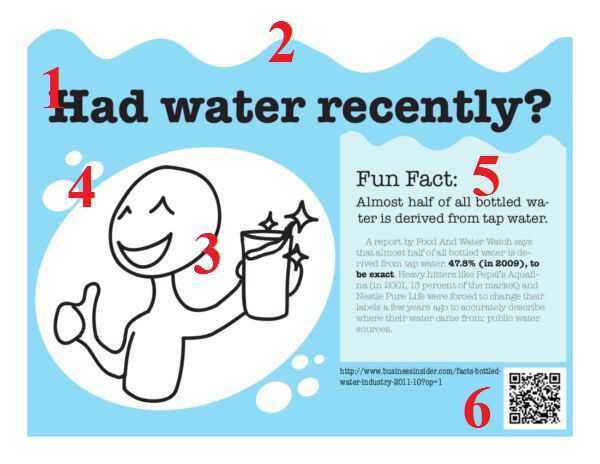 Elementos que se crearon en Adobe Illustrator como arte del vector. Arte de vector no sale pixelado cuando redimensionadas porque no hace fórmulas para volver a dibujar la imagen importa cuán grande o pequeño. Había dos cosas dibujan en Illustrator y son el patrón ondulado (2) y la figura sostiene el vidrio (3). El patrón de las ondas fue utilizado otra vez más adelante con un cambio de color del cuadro "dato curioso".
