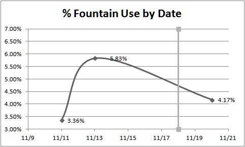 Aproximadamente una semana después de las cuentas originales fueron hechas, los carteles fueron puestos durante el primer y segundo piso del pasillo de Poe. La próxima vez que se recolectaron los datos, dos días después, encontramos que sólo 21 personas bebieron agua de la fuente de agua y sólo 7 personas llenadas botellas de agua de las 671 personas que caminaron más allá de las fuentes de agua. Es más un 3 por ciento de la gente pasar el agua. La cantidad de personas que llenaron sus botellas de agua superó apenas el 1 por ciento. Los datos fueron recogidos en circunstancias similares como los datos anteriores. La hora del día era el mismo y la temperatura exterior permaneció sin cambios. Había aún gran número de estudiantes que llevaban las botellas de agua ya completa así como sus compras desde la tienda de café local. Antes de que los carteles fueron puestos para arriba tuvimos 52 estudiantes beber agua de las fuentes de agua en el segundo piso del Hall de Poe en la Universidad de estado de Carolina del norte de las 1046 personas que caminaron más allá de las fuentes de agua, abarcan un tiempo de 4 horas. Esto significa que sólo el 5 por ciento de las personas que caminaron más allá la realidad dejó de las fuentes de agua para tomar una copa.