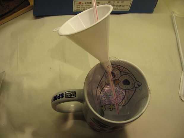 Mientras tanto, ponga el starter en la bolsa y el hilo en una paja para ayudar a mantener abierta a fondo cuando usted llene (y para apoyar el embudo). Colocar un embudo en la apertura y apoyo en recipiente adecuado s (hemos utilizado una taza).