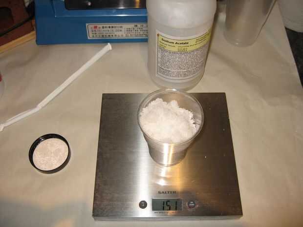 Pesar el acetato de sodio - se utilizó 150g de dos bolsas, basadas en piezas de 11 x 13 cm de vinilo.