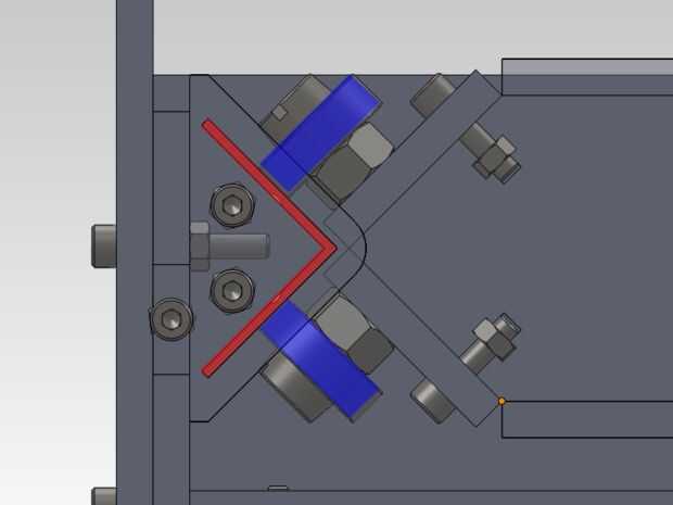 Siguiente imagen: cerca de la estructura; utilizando rodamientos ampliamente disponibles (patín) (azul) y perfiles de aluminio de la esquina (rojo). Este sistema ferroviario garantiza un movimiento suave de los trenes y no hay movimientos en otras direcciones de otros entonces el carril.