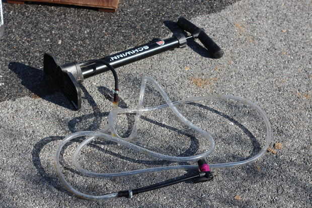 Extender la longitud de la manguera de la bomba de bicicleta por cortarlo por la mitad y añadir en el tubo transparente. Utilice abrazaderas para sellar los extremos.