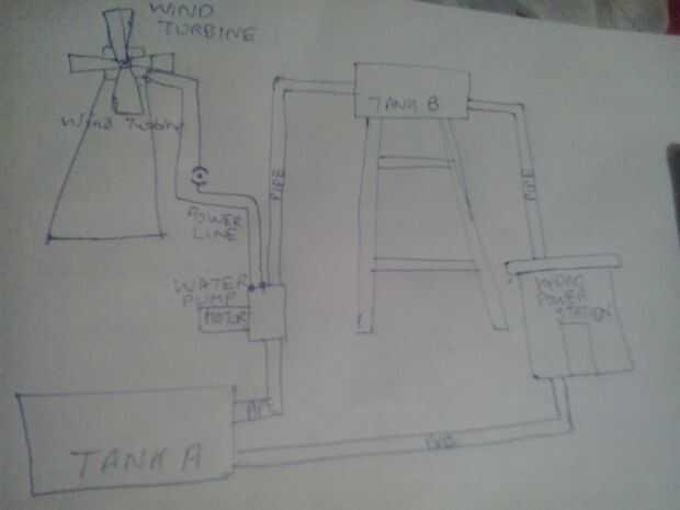 -(Si usted piensa que la energía eólica puede ser utilizada directamente pero sólo está disponible cuando el viento sopla pero en almacenamiento de agua en alta hace que el tanque B una batería y puede ser usada en cualquier momento)