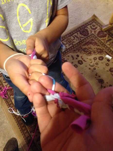 Tenemos entonces todas las otras piezas de las tiras de ella corta de las tres camisetas repurposed y hecho largos cordeles que nosotros luego trenzados en una trenza de tres cordón atado. Esto entonces fue doble enrollado y atado en la parte superior haciendo un bonito collar.