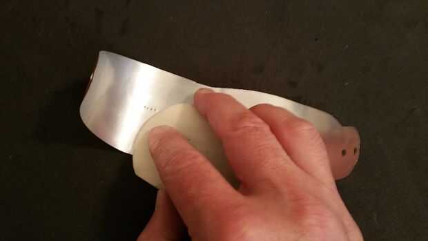 Luego tienes que lijar ligeramente el interior de la pieza de lata para un acabado liso alrededor de los agujeros perforados (agujeros de alfiler y canutillo con los agujeros para las gomas. Tomar su aguja y muy suavemente inserte en agujero de la parte interior y girar ligeramente hacia adelante y hacia atrás para crear un bonito agujero liso.