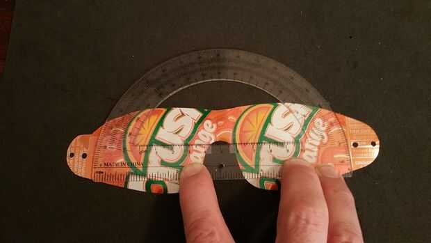 Este es el proceso más crítico y difícil. Establecer la plantilla de lata con el lado de impresión hacia arriba. Colocar 2 trozos de cinta adhesiva a lo largo de la mitad de la plantilla a lo largo. Coloque el transportador u otra regla métrica y nivel/centro en la abertura de la nariz en medio de patrón.