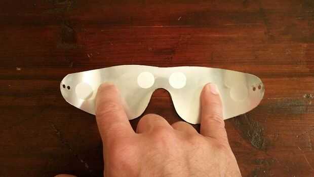 Establecer su patrón de espuma sobre una superficie plana. Tome su pedazo de lata respaldada por adhesivo (con impresión lado hacia arriba) y aplicar la espuma a partir de la zona centro de la nariz y moviendo hacia fuera asegurar la espuma está alineado con los bordes de la lata. La espuma debe coincidir o superponerse ligeramente el patrón de estaño a lo largo de todos los bordes. Finalmente, utilizando el 1/8" punzón y utilizando los orificios preexistentes en el patrón de lata como guía, perfore 4 agujeros en el patrón de espuma para permitir que la cinta de la cabeza de goma.