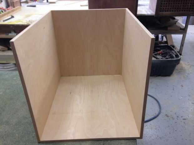 Cortar laterales, fondo y frente a los tamaños que decidió en su lista de corte. La espalda debe deslizarse entre los lados y la estructura se establecerá en la parte inferior. Agregue el pegamento a los bordes y poner en su lugar. El pegamento lo sostenga en su lugar el tiempo suficiente para que usted pueda añadir grapas en el lado. Cada grapa debe ser aproximadamente 2 pulgadas de distanciadas. Al final, usted debe obtener un cubo sin frontal o tapa.