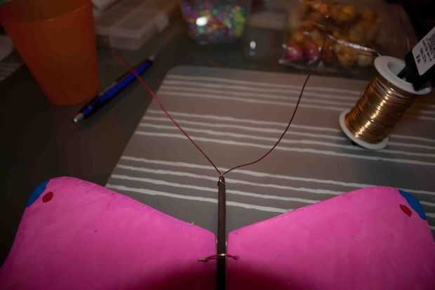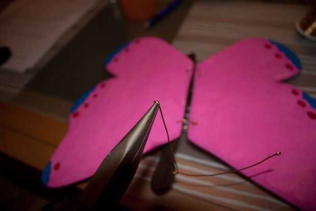 Para hacer las antenas de mariposas, pase un alambre por el agujero en la cabeza del cuerpo. Tuerza el alambre cerca para que permanezca en su lugar. Luego curva a la forma de las antenas como tú y tu hijo le gusta. Al final de las antenas, utilice alicates de nariz a rizar los extremos de las antenas para que el diseño sea seguro para tu hijo.