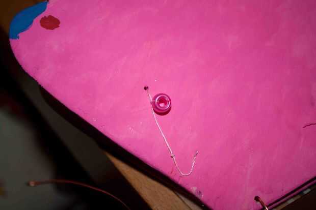 El otro extremo de la cuerda a través del segundo orificio del ala, ajustándola a la ala con otro grano o nudo del hilo de rosca.