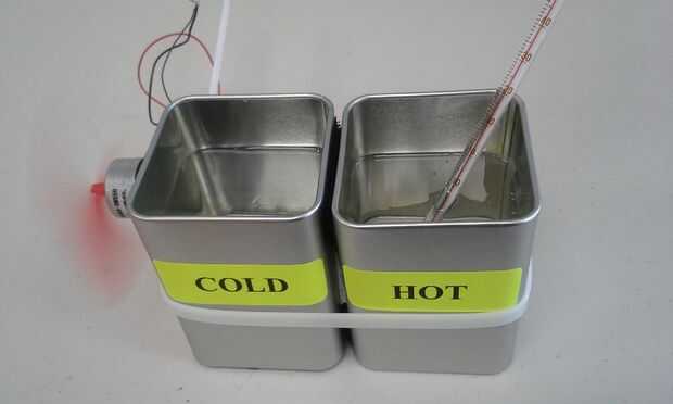 Puesto que el generador termoeléctrico trabaja de diferenciales de temperatura, utilizando un termómetro de alcohol, puede medir la temperatura de líquidos fríos y calientes y ver a que temperatura la hélice empezará y luego deje de girar. Puede tomar unos minutos para grabar el tiempo así.
