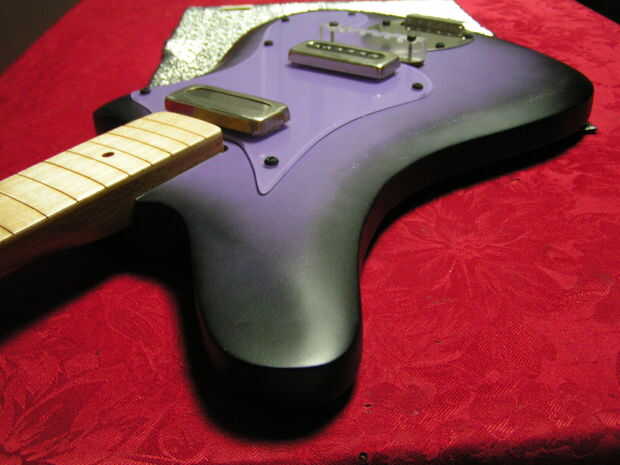 he aplicado hasta el cuello y el cuerpo que se destroza en mi último proyecto, (la guitarra del patín) y experimentó con la pintura de aerosol y la idea de usar la tela como una plantilla.Usé pintura de Dupli-Color carro/Van/SUV, que creo que es una