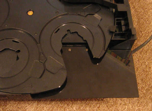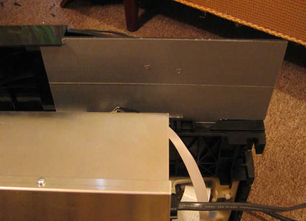Sin importar qué cambiador marca utilizas para un proyecto como este, probablemente tendrás que hacer a algún tipo de relleno de brecha. Rellenar estos huecos puede hacerse bien con/policarbonato Lexan (disponible en Home Depot o grifo plástico) pintado para combinar con cualquier color. Después de cortar una pieza que encaja, me pintó la parte de atrás de él negro, esperando la pintura se seque, luego cubrió la pintura con una capa de cinta adhesiva. Yo sabía ser exprimir esta cosa en su nueva casa, así que la cinta fue sólo proteger la pintura de ser dañado.