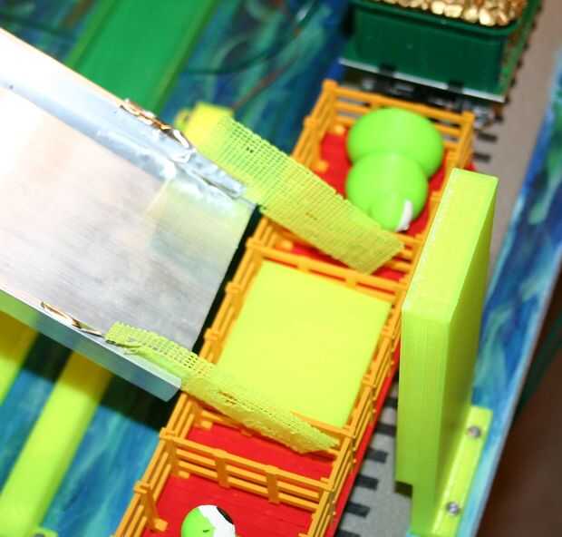 tuve que agregar un respaldo y un bloque de control donde la rana aterriza cuando sale el balancín.  También he añadido un par de "alas" (impresión en 3d de la balsa) hasta el final del balancín para impedir que escape la rana.