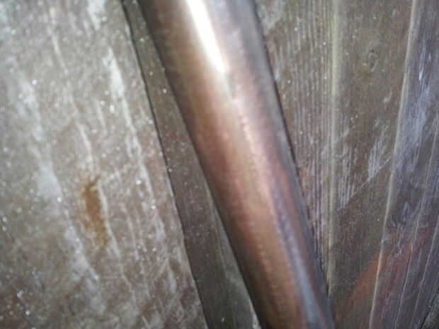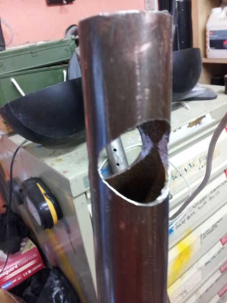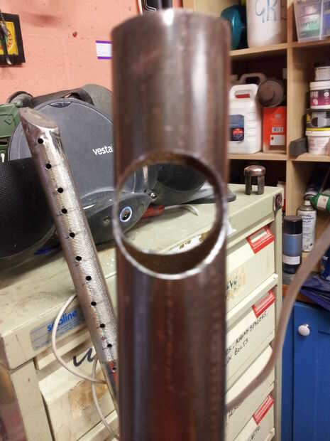 Un viaje rápido para el depósito de chatarra y encontré una pieza ideal de tubos de acero para solamente £2. Había llegado a ser bastante oxidado así que usé el cepillo de alambre en mi amoladora para deshacerse de él. Esto reveló una capa cobre peculiar, que no esperaba encontrar bajo el moho pero realmente parecía realmente bueno. Para incorporarse a la hoja al mango que quería asegurarse de que tenía un muy fuerte conjunta, ya que la hoja es extremadamente pesado y aún sin filo podría hacer algún daño grave si fuera a caerse. Para ello, utilicé el taladro con una sierra de metal para hacer un gran agujero a través, donde iría el tubo de llama.