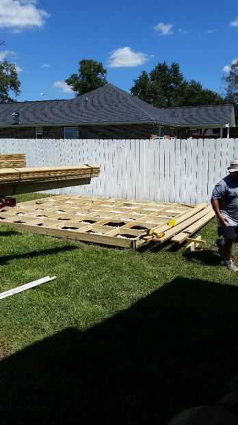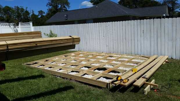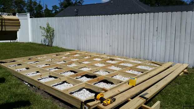 Después de construir el marco asegura era cuadrado y comencé a colocar paño paisajismo entre la viga de piso y y luego 2 "x 4" bloqueo entre la vigueta. Poner el paño primero facilitó el lugar abajo. Procedió con la roca. Desde la roca en bolsas sólo comencé a verter una bolsa después de nivelar otra con mi pie hasta que se llene cada parte de la estructura. Comencé en la parte de atrás y pasaron al frente. Elegí paisajismo paño para ayudar a parar la mayoría de las malas hierbas y la hierba crezcan más adelante y el rock para el drenaje de la estructura como el sistema de la niebla vino en.