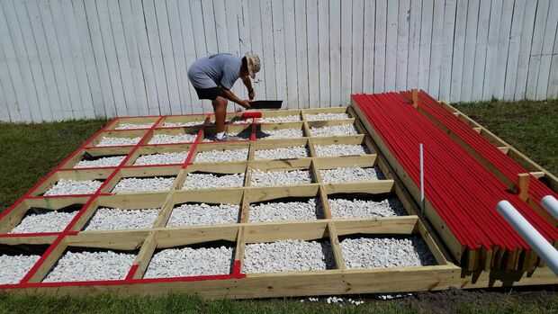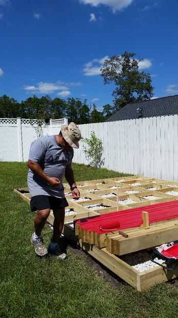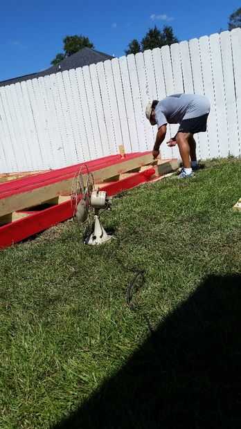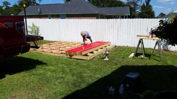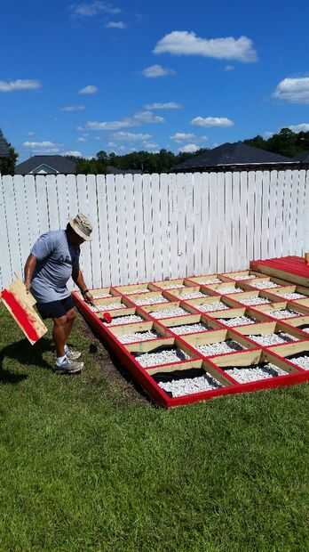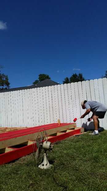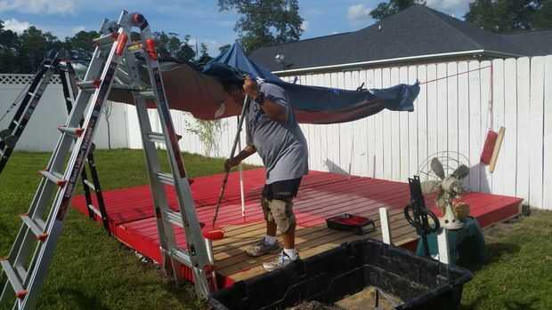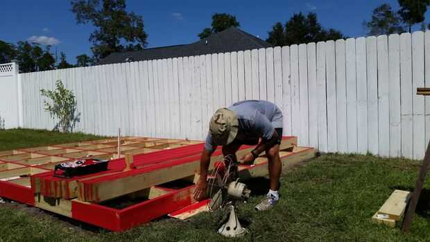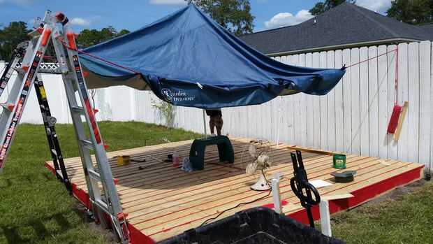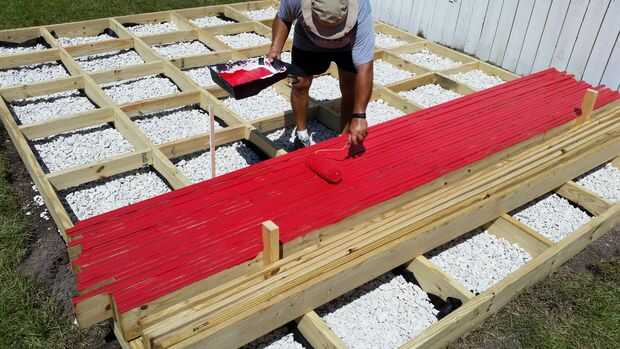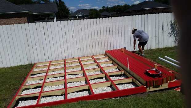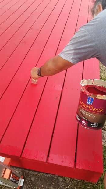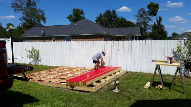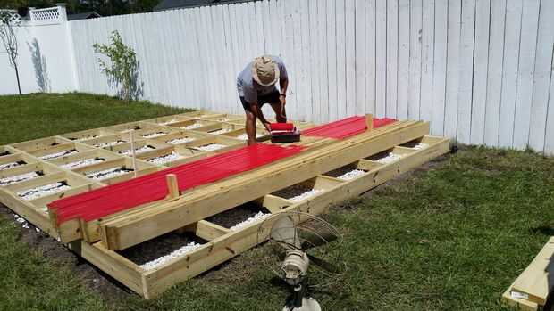 La cubierta era 1 "x 6" x 12' cubierta de madera tratada a presión. Revisé para lo cuadrado de la estructura del suelo y comenzó a colocar las placas de cubierta trabaja desde el exterior hacia el centro. Lo hice para que la cubierta sería uniformemente y también porque tenía que recortar el orificio de 3/4 para la tubería del sistema de riego en el centro. Usé 3" tornillos de largo de la construcción para garantizar la plataforma hacia abajo. Usé 1 galón de pintura de cubierta roja y 1 galón de capa transparente de Sherwin Williams. Cierren las juntas de la cubierta de un lado primero a pintar los bordes y luego después de tres capas les volcó y pintar el otro lado. Pinté el marco de la cubierta antes de fijar las placas de la cubierta hacia abajo para que usted no vería el oso de madera entre el espacio de la cubierta. Espaciamiento fue de 1/4 de pulgada que algunos desechos de madera como separadores. Una vez que asegura la cubierta hacia abajo con los tornillos de 3 pulgadas que procedí a pintar la cubierta y la parte de la estructura con tres capas de pintura. Luego usé el sellador sobre la pintura de la cubierta para asegurarse de que era a prueba de agua.