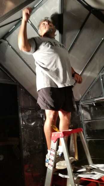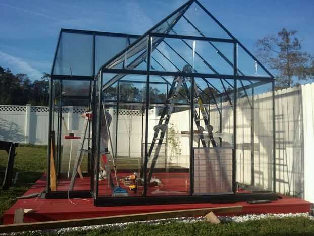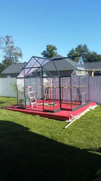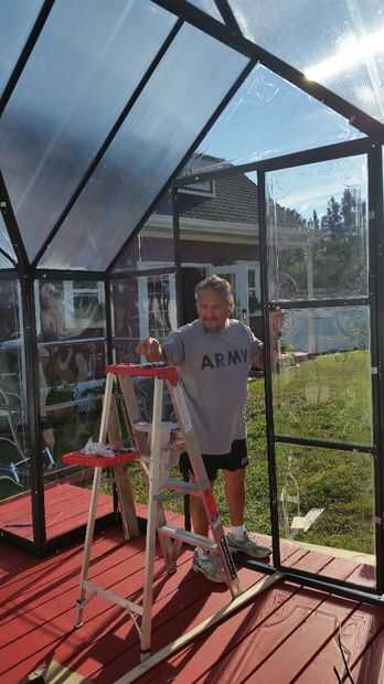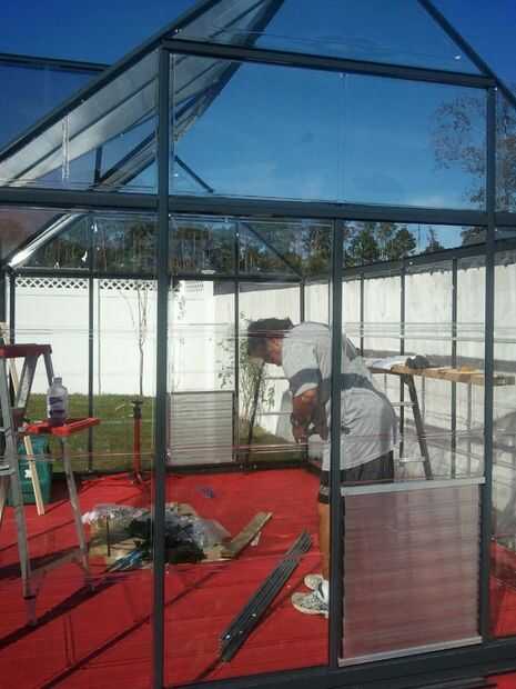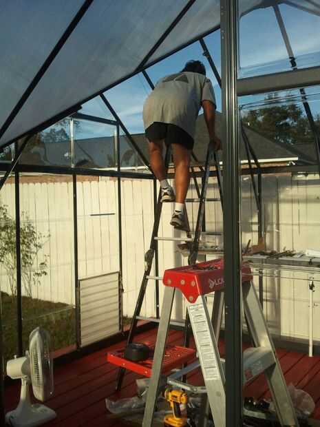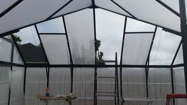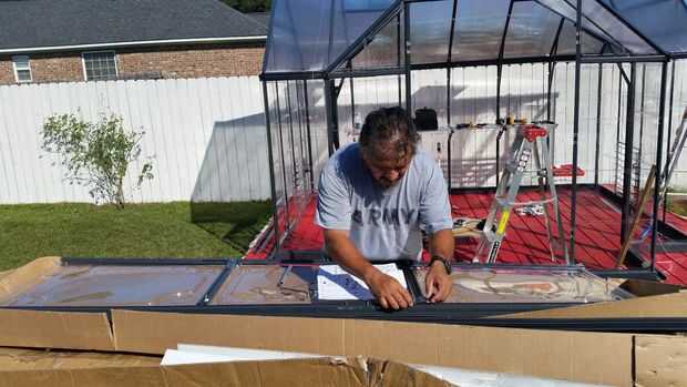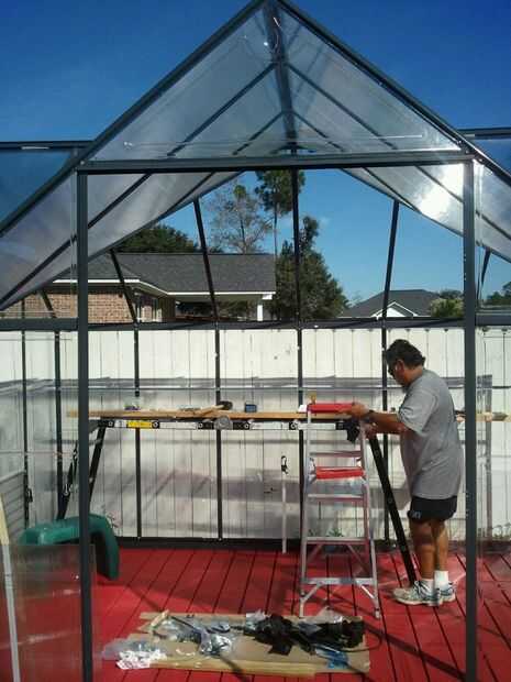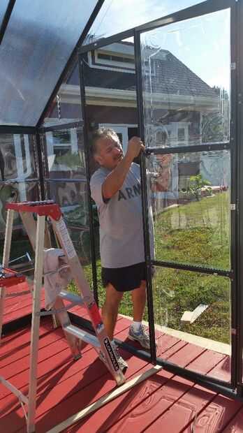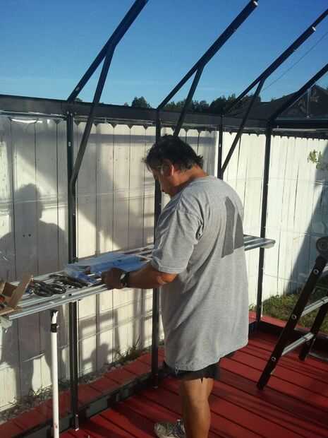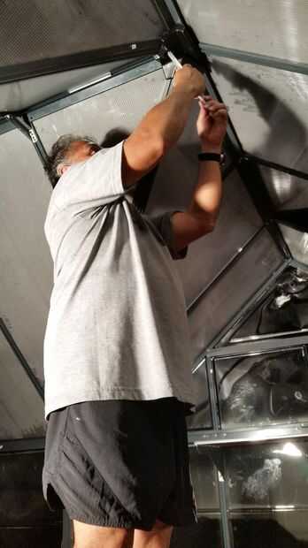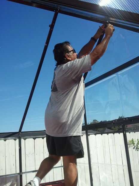 Una vez todos los paneles y marco de la pared hasta que procedí con la estructura del techo. Comencé en el frente y entonces había trabajado mi manera a la parte posterior. Una vez que se realizaron los paneles de techo trasera coloqué las ventilas cenitales en. Después de las rejillas de ventilación en llegó la hora de los amarres de dos cable del invernadero. El amarre de cables y anclajes vienen con el efecto invernadero. Me decidí a montar el anclaje a la viga de piso utilizando los tirafondos de 1/2 pulgadas que viene con el kit de amarre. Cable viene con cuatro sillas para las cuatro esquinas pero realmente necesitas tener dos sillas en cada una de las esquinas de un mínimo. Entonces fue a de Lowe y compró cuatro sillas más y poner en. En este punto añadí las estanterías al mismo tiempo que el sistema fue debido a la forma que se construye la pared del fondo. La pared del fondo tiene tirantes verticales que van la construcción final y ocupan el área que se necesita para montar las estanterías. Había modificado los soportes verticales por hacer agujeros para los tornillos de la estantería y me continuación, poner todo junto al mismo tiempo. Una vez que se completó no puede decir la diferencia si fue hecho o no en fábrica. Puertas fueron la última parte del kit de efecto invernadero para subir. Puertas eran fáciles de armar y colocar en el marco de la puerta. Las instrucciones para el invernadero fueron todos los dibujos de cuadro con números, sin palabras excepto seguridad al principio. Así inventario y el diseño hizo la construcción sube suavemente. De cara al futuro también asegura una estructura lisa porque los cuadros son blanco y negro y no el mayor.