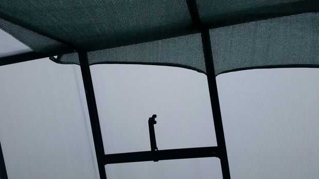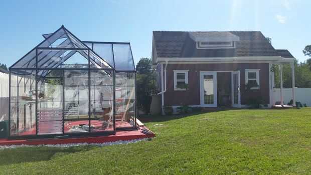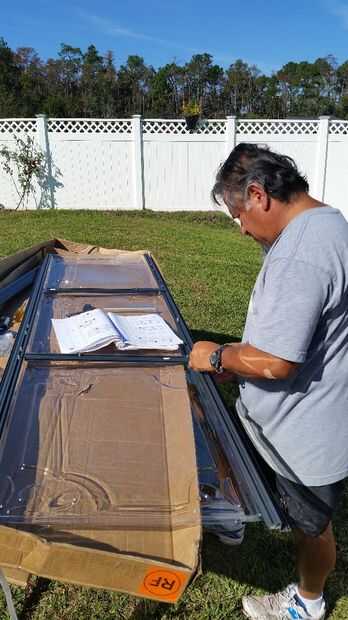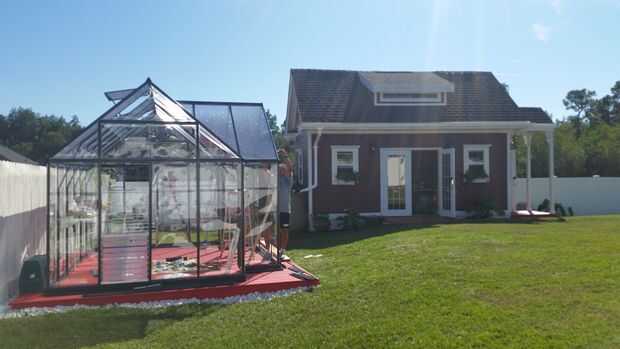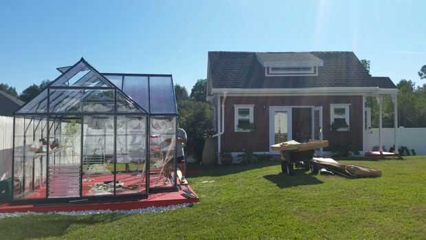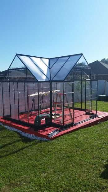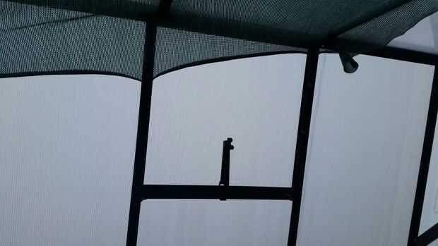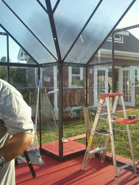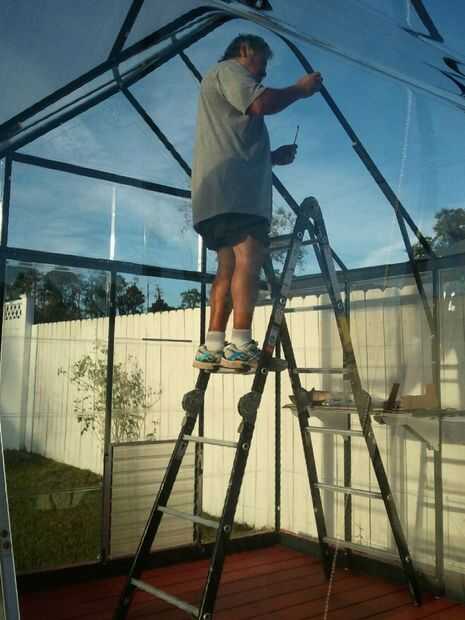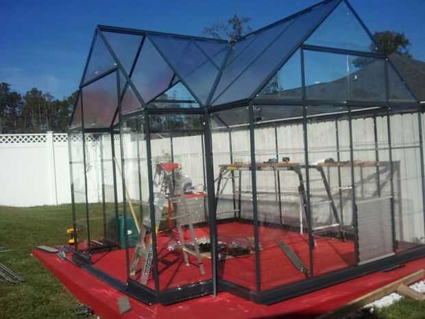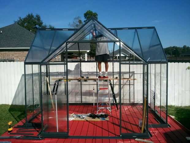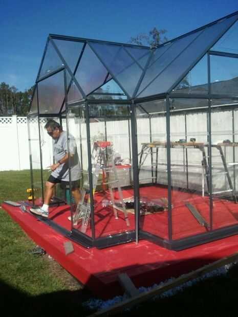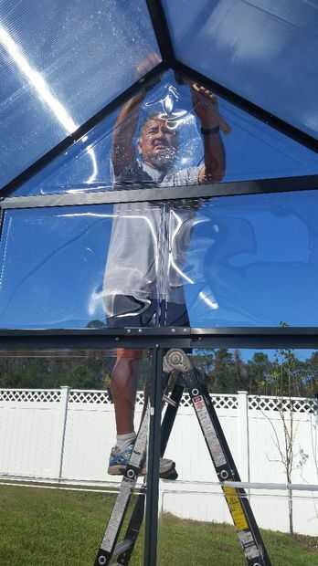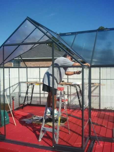 Una vez todos los paneles y marco de la pared hasta que procedí con la estructura del techo. Comencé en el frente y entonces había trabajado mi manera a la parte posterior. Una vez que se realizaron los paneles de techo trasera coloqué las ventilas cenitales en. Después de las rejillas de ventilación en llegó la hora de los amarres de dos cable del invernadero. El amarre de cables y anclajes vienen con el efecto invernadero. Me decidí a montar el anclaje a la viga de piso utilizando los tirafondos de 1/2 pulgadas que viene con el kit de amarre. Cable viene con cuatro sillas para las cuatro esquinas pero realmente necesitas tener dos sillas en cada una de las esquinas de un mínimo. Entonces fue a de Lowe y compró cuatro sillas más y poner en. En este punto añadí las estanterías al mismo tiempo que el sistema fue debido a la forma que se construye la pared del fondo. La pared del fondo tiene tirantes verticales que van la construcción final y ocupan el área que se necesita para montar las estanterías. Había modificado los soportes verticales por hacer agujeros para los tornillos de la estantería y me continuación, poner todo junto al mismo tiempo. Una vez que se completó no puede decir la diferencia si fue hecho o no en fábrica. Puertas fueron la última parte del kit de efecto invernadero para subir. Puertas eran fáciles de armar y colocar en el marco de la puerta. Las instrucciones para el invernadero fueron todos los dibujos de cuadro con números, sin palabras excepto seguridad al principio. Así inventario y el diseño hizo la construcción sube suavemente. De cara al futuro también asegura una estructura lisa porque los cuadros son blanco y negro y no el mayor.