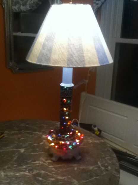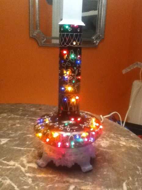 Supe enseguida que quería de alguna manera ilumina la base por lo que podría ser utilizado como una luz de noche. Originalmente quería utilizar LEDs pero que está más allá de mi capacidad eléctrica limitada así que fui con las luces de Navidad en su lugar.