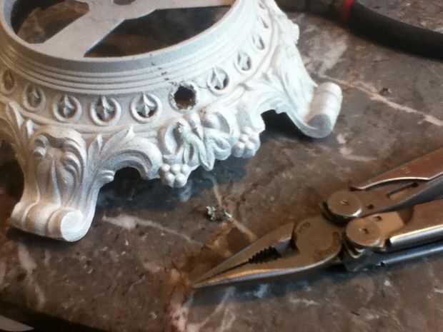 Para instalar el interruptor, primero tomé un destornillador y un martillo y golpeado hacia fuera en las hojas en la base. Luego tomó algunas agujas pinzas de punta y quita tanto del metal como pude. Una vez que la mayor parte del material se había ido, yo simplemente reprimieron la base y limpiar el agujero con un taladro.
