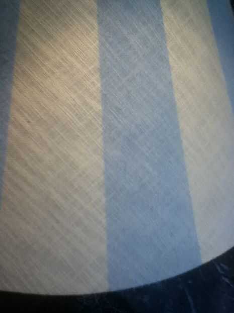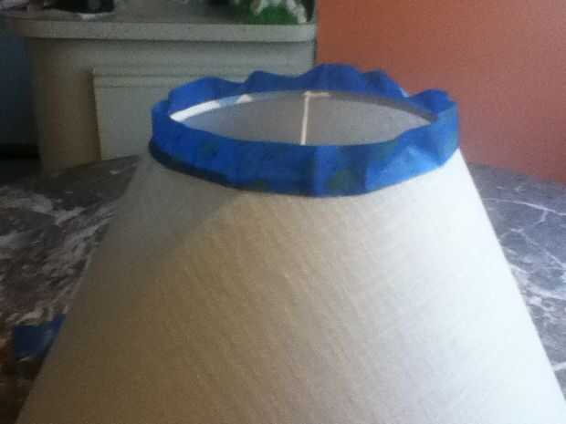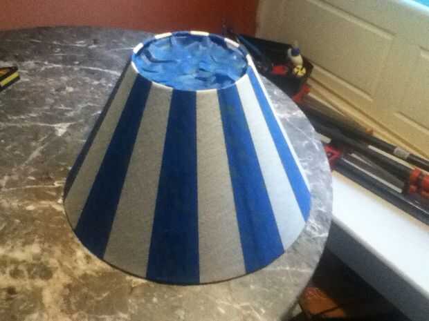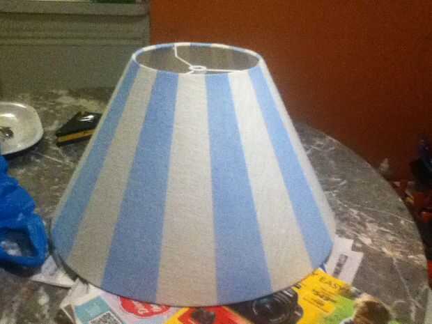 Esta lámpara se sentará en una mesa que hice hace unos años. La tabla es luz azul con rayas color rosa y flores pintadas en la parte superior. Para coordinar estoy rayas de pintura en la sombra que van con las rayas sobre la mesa.