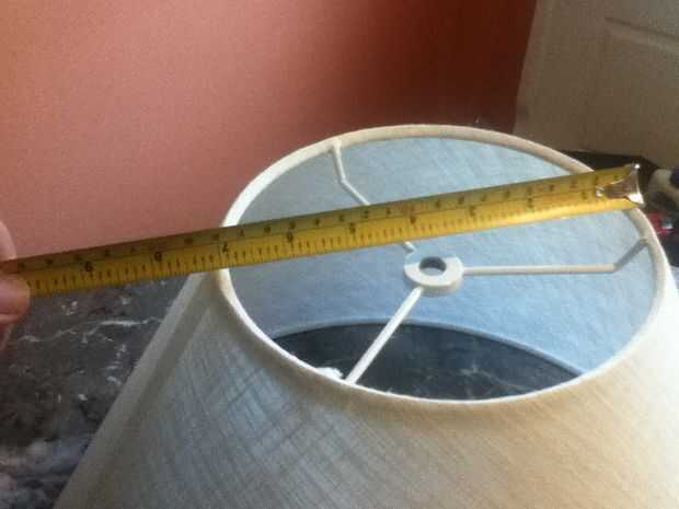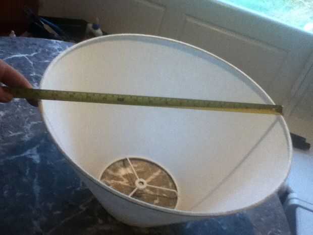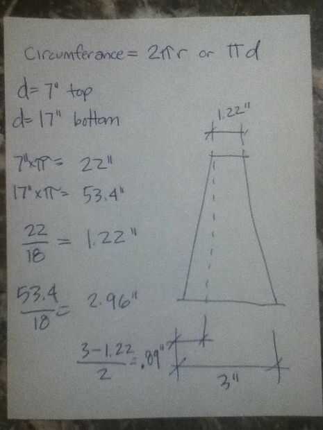 lo primero que hice fue medir el diámetro superior e inferior de la pantalla. Para esta cortina es el diámetro superior 7" y el diámetro inferior es de 17". El siguiente paso es calcular la circunferencia. la fórmula de la circunferencia es 2 pi x radio o pi x diámetro.