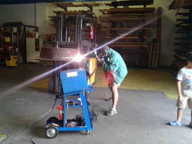 La base de la maceta es el la chapa soldada a la parte inferior del tubo.  Utilicé un soldador de carga puerto barato y tachuela soldada con autógena (10 puntos) la chapa a la tubería.  El montacargas tiene una mesa de trabajo grande.