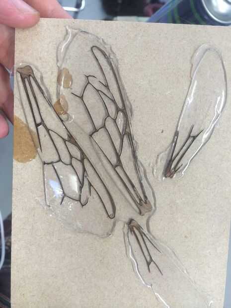 Para el ala de las abejas quería felicitar al peine de madera miel. Para hacer esto que del laser corte el detalle fino de la hoja de chapa de 0,5 mm nogal. Esto era muy complicado y frágil. Entonces solía resina poliester claro molde vierta sobre la chapa en un molde para crear la forma del ala.