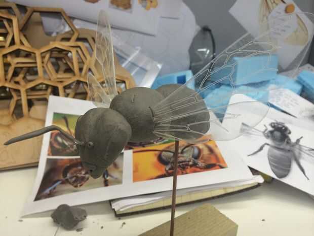 Pensé que sumando abejas desde una distancia a escala sería obvio lo que era el producto. Para hacer la abeja esculpidas con Plastaline. Después de alcanzar la escala derecha y forma moldea el cuerpo, piernas y cabeza.