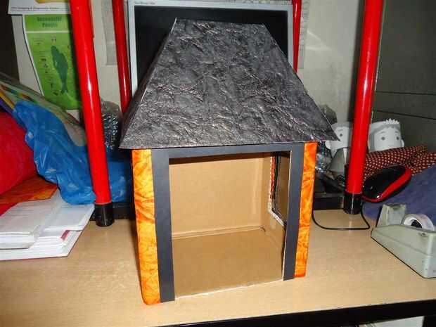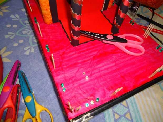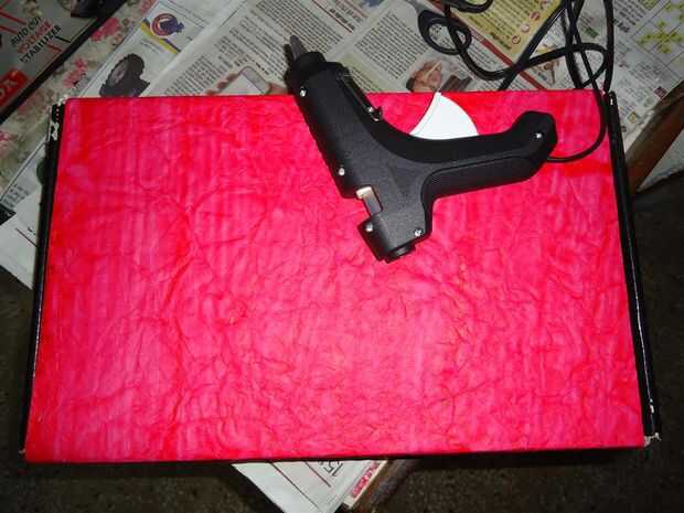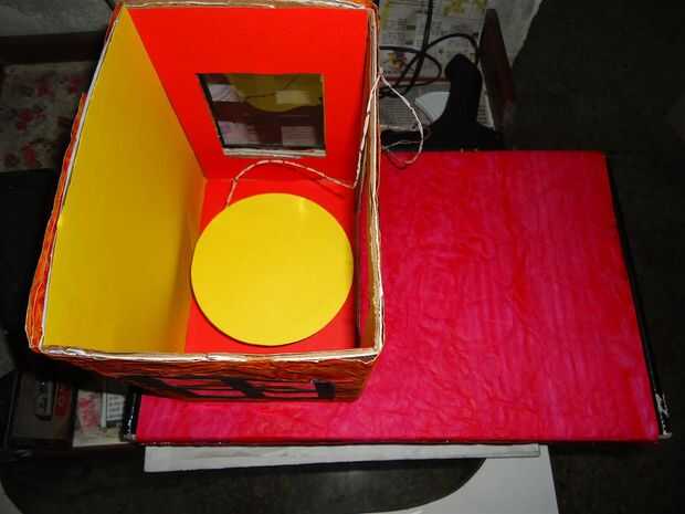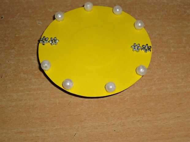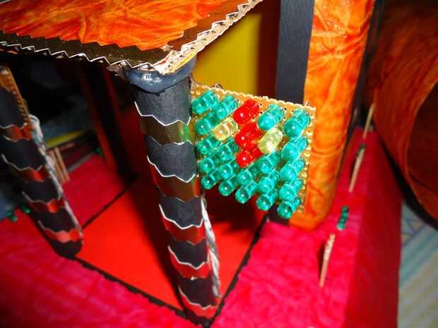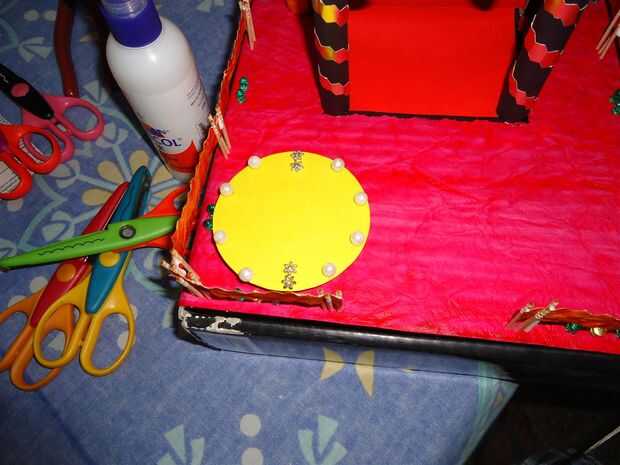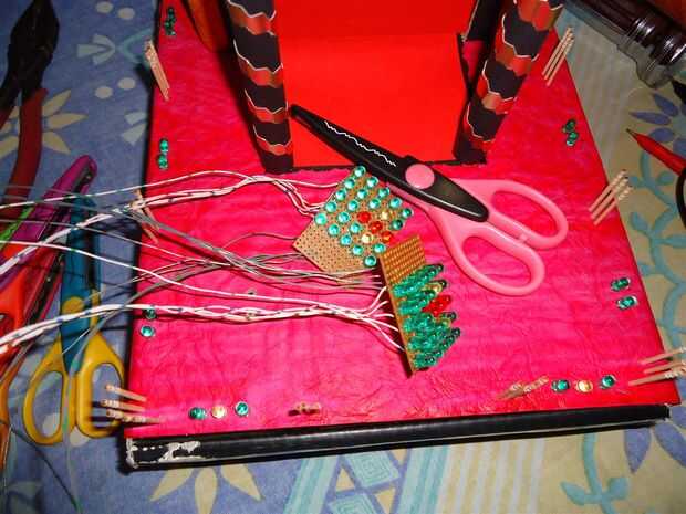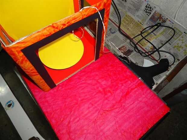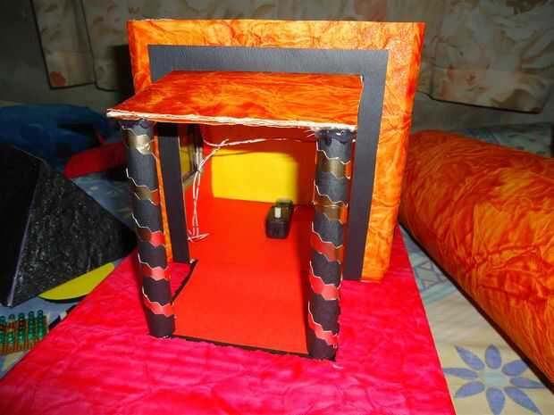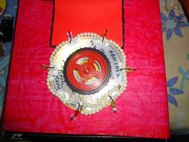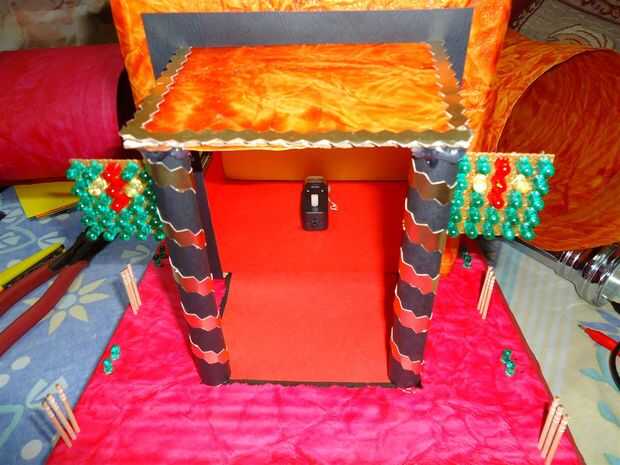 La base en el que reside la escultura del perro se hace usando un DVD poner una cubierta de papel colorido y se monta en un motor de 3/4 V BO también utilizando su rueda asociado para la Asamblea. El montaje del motor 2 º fuera del templo también es el mismo pero con un mini CD.